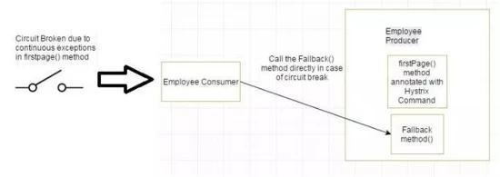 如果 firstPage method() 中的异常继续发生,则 Hystrix 电路将中断,并且员工使用者将一起跳过 firtsPage 方法,并直接调用回退方法。 断路器的目的是给第一页方法或第一页方法可能调用的其他方法留出时间,并导致异常恢复。可能发生的情况是,在负载较小的情况下,导致异常的问题有更好的恢复机会 。