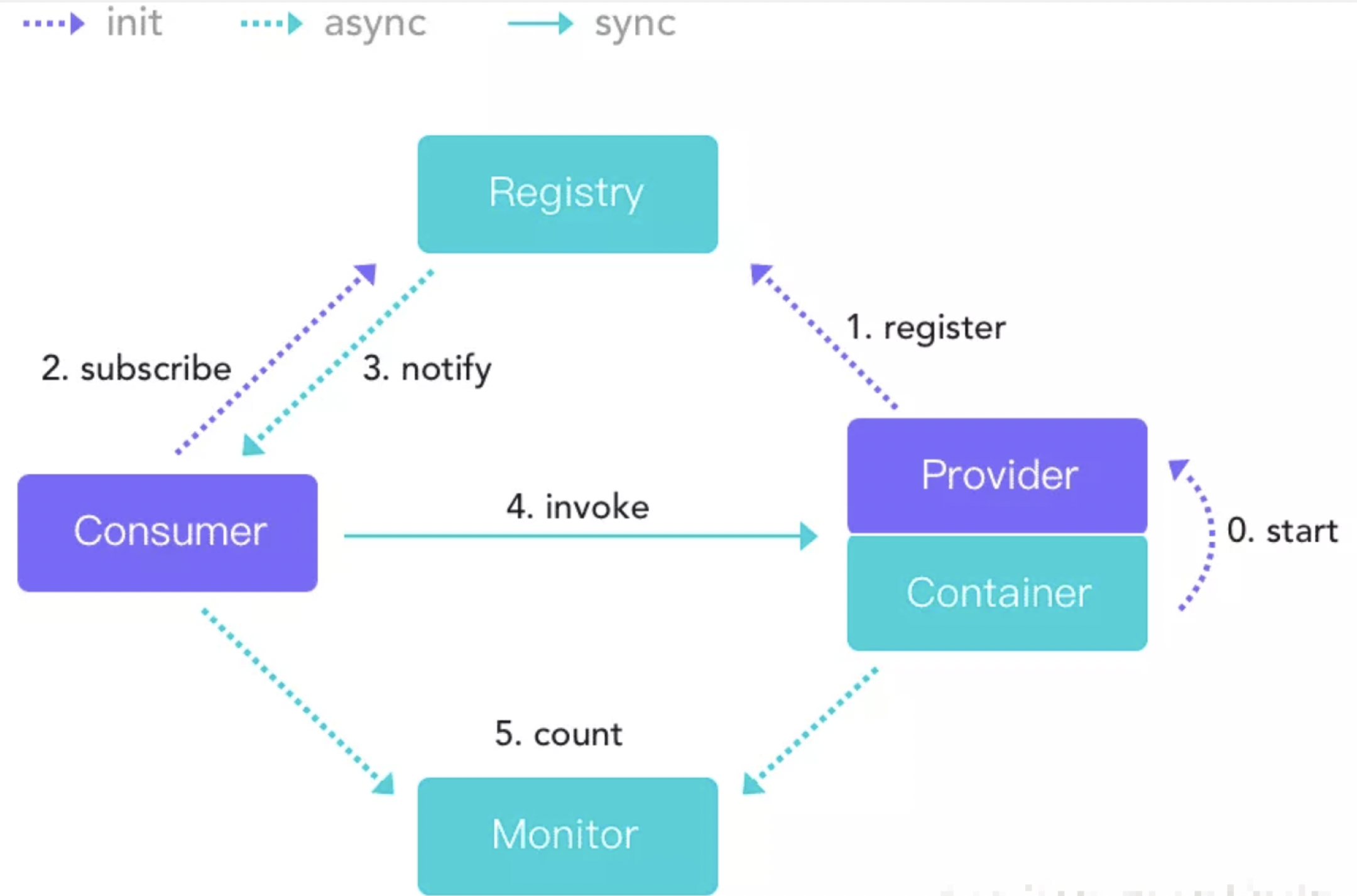 - Container: 服务运行的容器(dubbo容器只是一个简单的main方法,并加载一个简单的Spring容器,用于暴露服务)