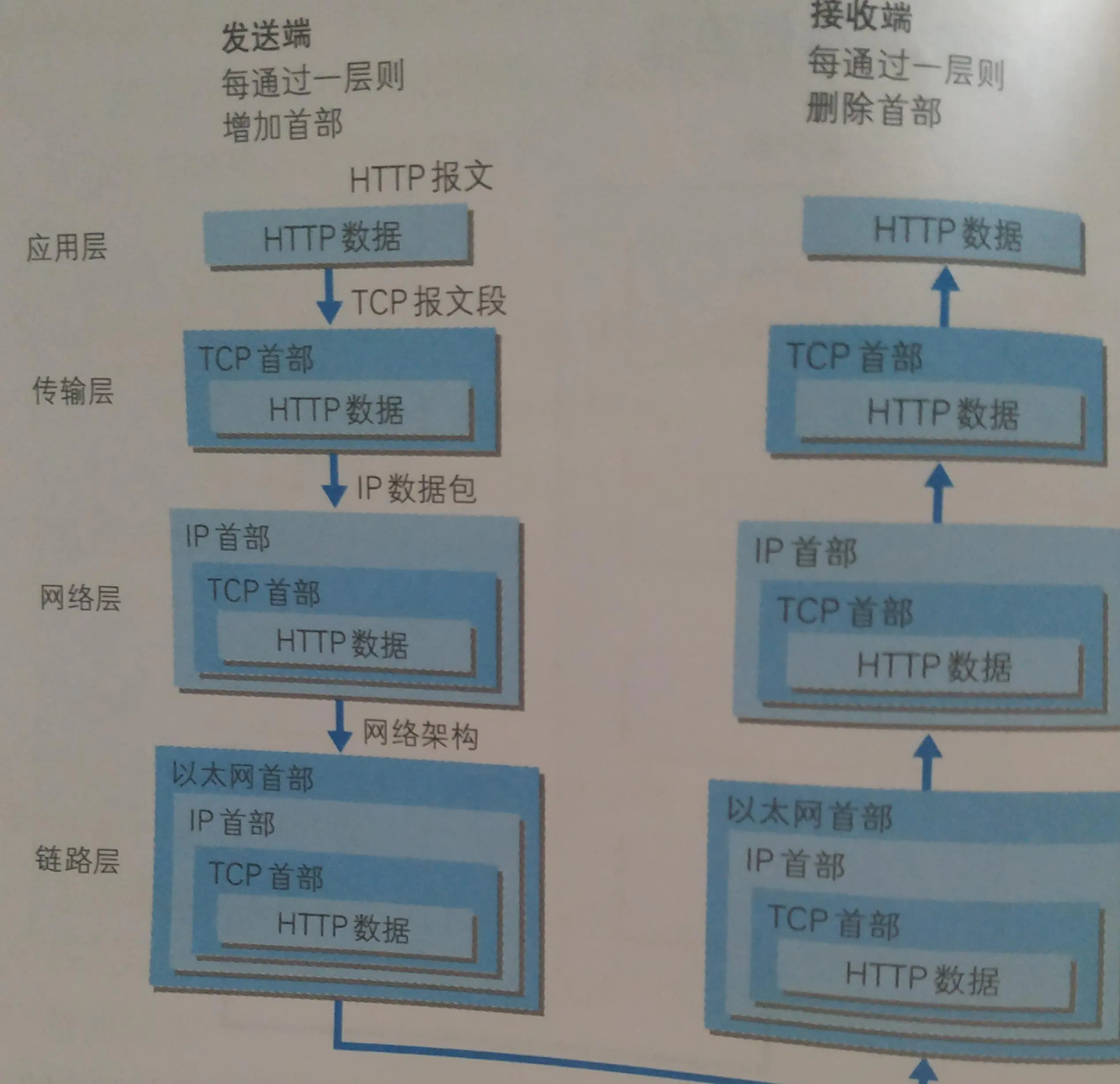 TCP/IP协议族分为应用层,传输层,网络层,链路层。发送端从应用层到链路层,接收端从链路层到应用层。