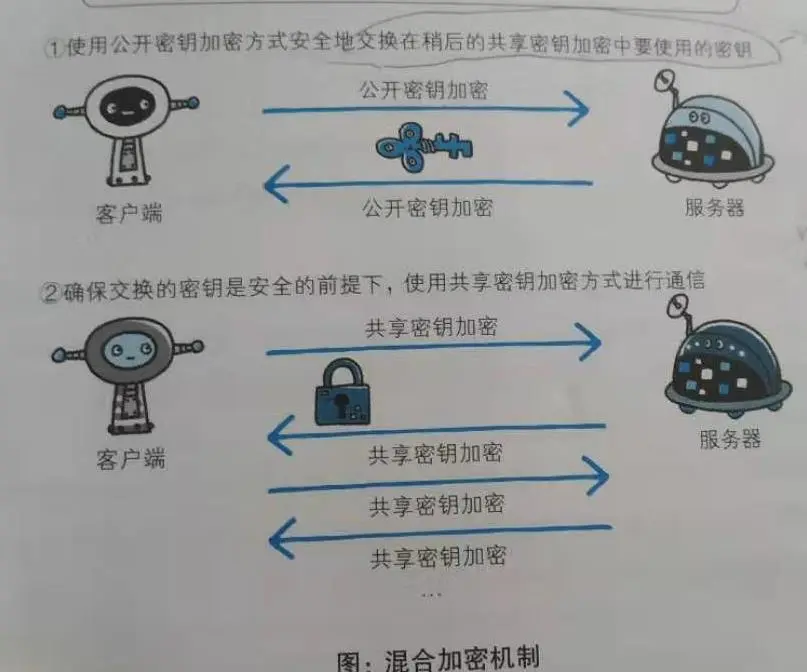 结合两种加密方式,将对称加密的密钥使用非对称加密的公钥进行加密,然后发送出去,接收方使用私钥进行解密得到对称加密的密钥,然后双方可以使用对称加密来进行沟通。