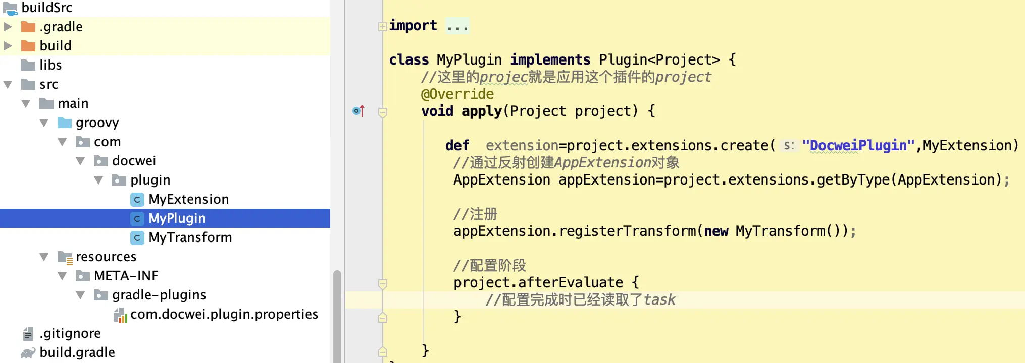 - 1. 自定义插件需要创建一个类(比如:MyPlugin)去实现Plugin接口,重写里面的apply方法,其参数project即为应用了这个插件的project,这里是app的build.gradle应用了。