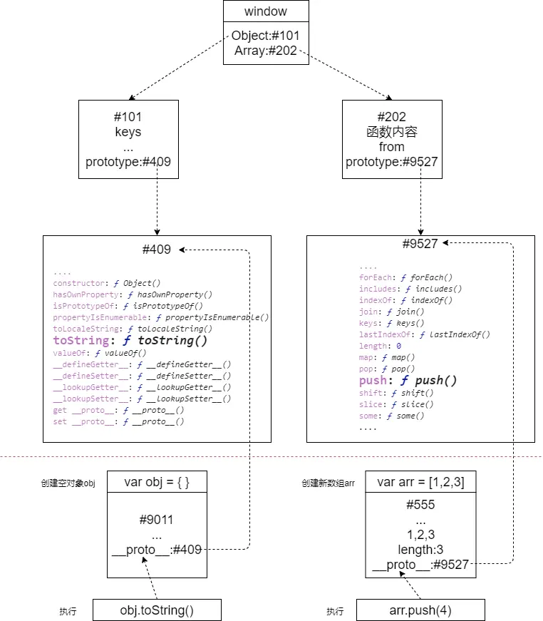 请画出 obj、arr 与 window、Object 和 Array 的关系。