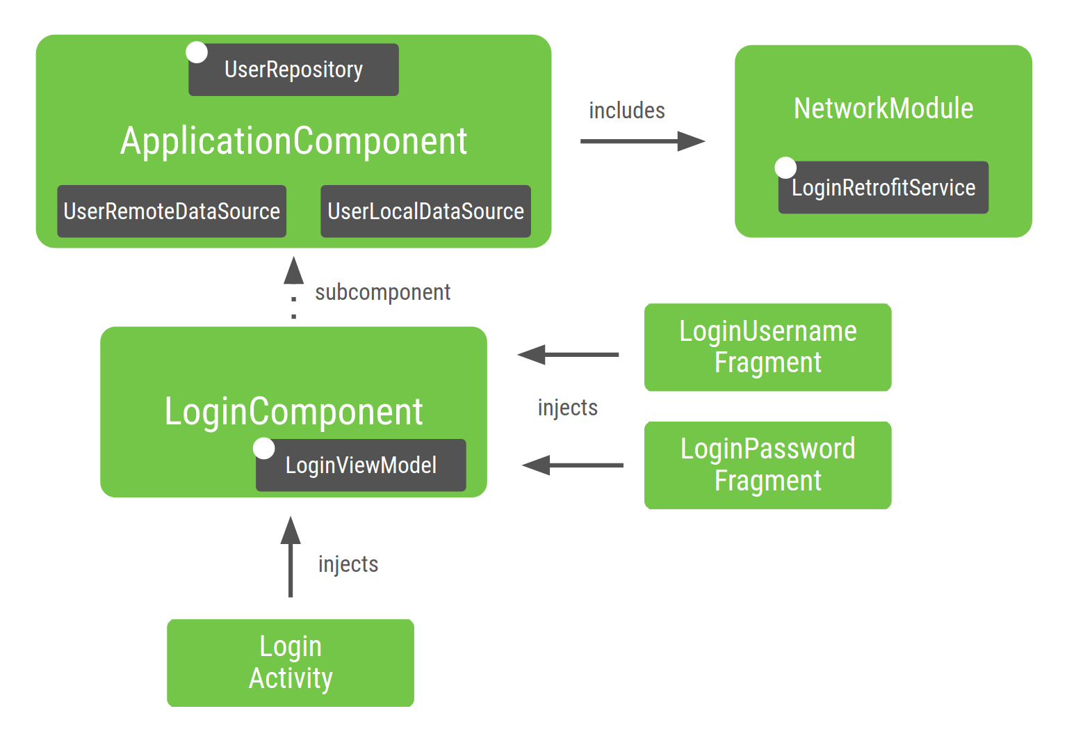 图3显示了带有新子组件的Dagger图。带白点(UserRepository,LoginRetrofitService和LoginViewModel)的类是具有唯一实例的实例,该实例的作用域仅限于其各自的组件。