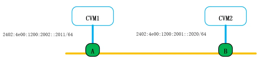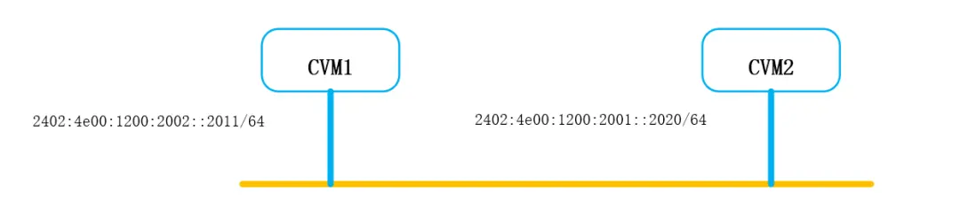 如下图所示,云主机CVM1要和CVM2通信(假设CVM的IPV6地址和VPC已经按文档https://cloud.tencent.com/document/product/213/40010正常配置且IPV6路由和地址检查都正常)。
