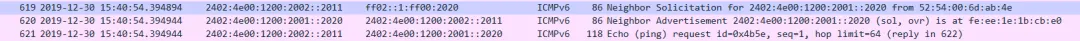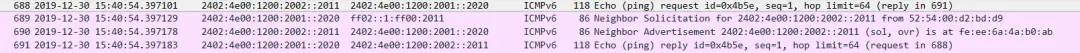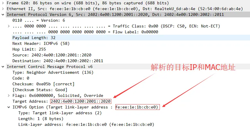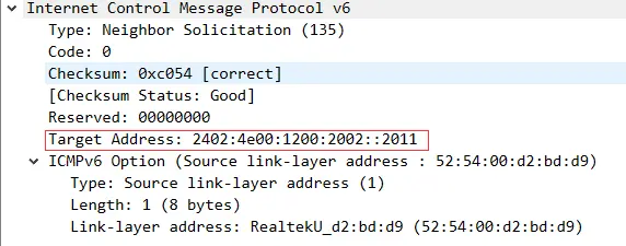 Step6:为了学习到目标地址2402:4e00:1200:2001::2020对应的MAC地址,首先发送NS报文:Type字段值为135,Code字段值为0,在地址解析中的作用类似于IPv4中的ARP请求报文。
