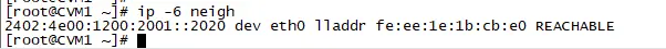 学习到目标地址2402:4e00:1200:2001::2020对应的MAC地址是fe:ee:1e:1b:cb:e0。学习到的MAC存入到IPV6邻居表中: