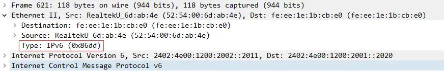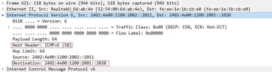 Step11:IPv6协议处理头部,检查目标IP正确,检查下一个协议头部类型是ICMPv6。
