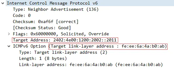 Step7:CVM1发送的NS请求报文给到虚拟网关路由器,虚拟网关路由器收到NS报文后查看路由表匹配到路由2402:4e00:1200:2001::/64,代理目标地址回复一个NA报文:Type字段值为136,Code字段值为0,在地址解析中的作用类似于IPv4中的ARP应答报文。