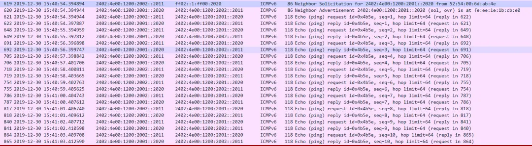 这里并没有学习到目标IPv6地址2402:4e00:1200:2001::2020对应的MAC地址,导致无法进行数据链路层封装。