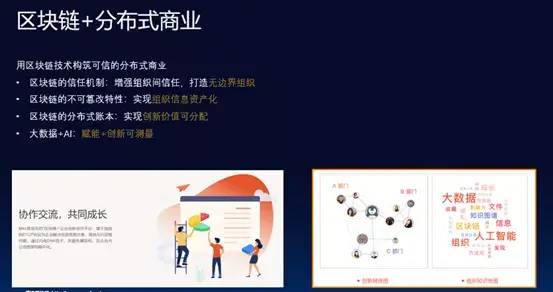 在这样的思考下衍生出来另外一个很有意思的应用场景,我们自己做了很长时间区块链研究后有一个判断,其实区块链的理想场景不是To C,而是To B的场景。我们帮社会标识和筛选信息,能不能帮企业呢?如果把企业/组织看成是生命体的话,那这样一个整体、系统是否在高效地落地信息?所以我们用区块链技术打造了分布式组织智库体系,可以帮助组织解决信任问题,帮助组织更高效地获取信息,让信息在组织内部高效流转,由此可以帮助企业实现创新。