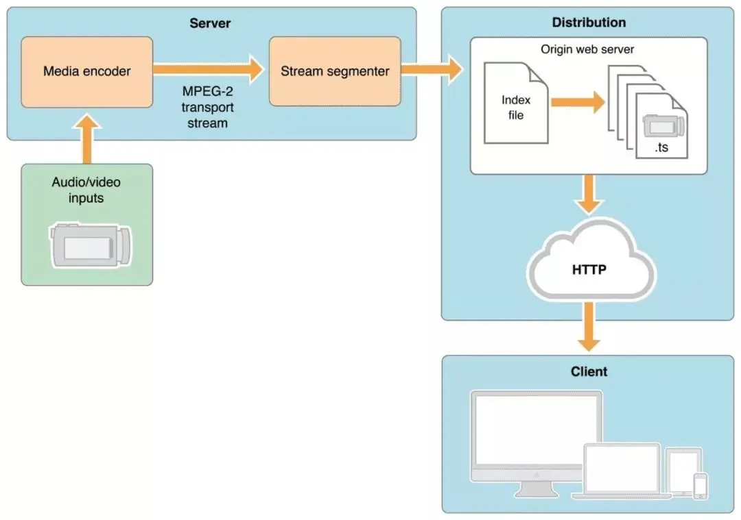 Server获取媒体输入流,Media编码 MPEG-4(H.264 video 和 AAC audio),然后打包到 MPEG-2 (MPEG-2 transport stream)的传输流中,传输流会经过Stream segmenter,MPEG-2传输流会被分散为小片段然后保存为一个或多个系列的 .ts 格式的媒体文件。Distribution