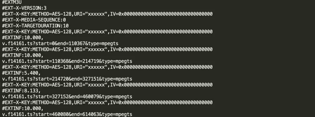- METHOD ---包括NONE、AES-128、和SAMPLE-AES。如果该值是NONE或播放列表没有定义该标签,表示媒体段没有被加密。如果设置了NONE,则其他属性不会出现。其中AES-128表示媒体是由AES-128标准构造的的128bit的 key,和密码块链接(CBC)和PKCS7加密组成的,URI 参数必须出现在METHOD后面;