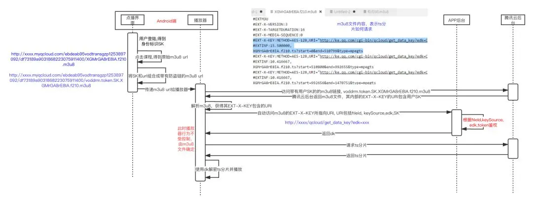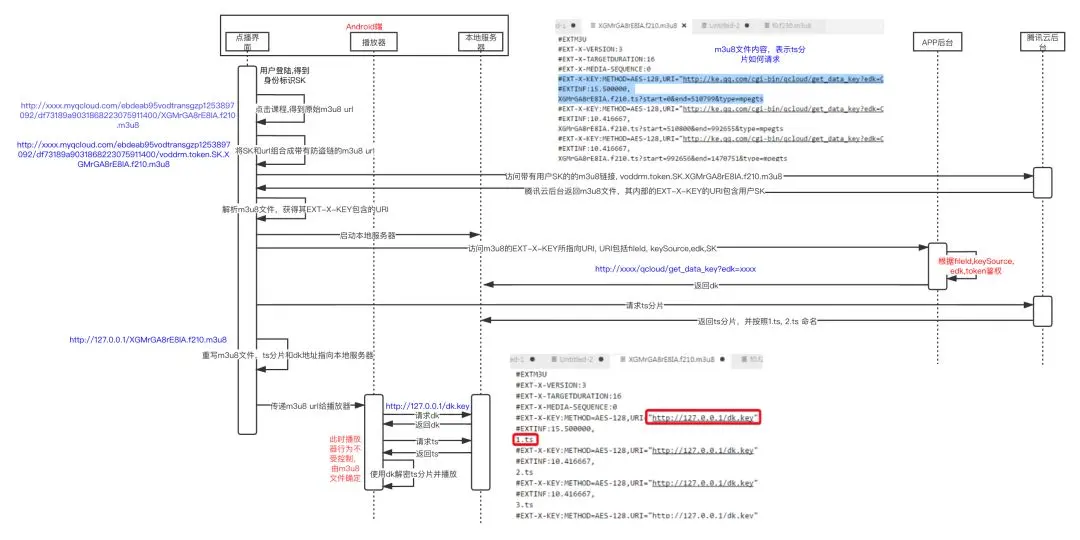 - 第四步将请求的 URL 透传给教育自研的播放器 ARMPlayer,ARMPlayer会启动本地代理,请求数据/解码/渲染。课堂采用的是HLS加密 [1],所以播放的时候还需要通过DK(密钥)进行TS解密。