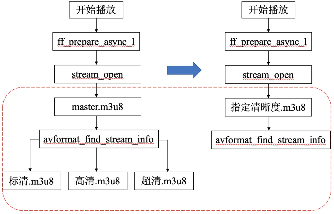 - 播放器从master.m3u8改为指定清晰度.m3u8透传给FFmpeg,减少avformat_find_stream_info串行拉取3个清晰度和第1个TS分片的耗时。