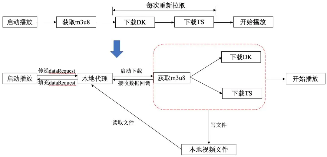 第一步启动本地代理,通过上层透传的本地存储的URL,读取DB中的指定清晰度的 m3u8 链接和指定清晰度的 m3u8 的内容;