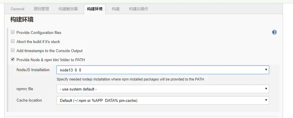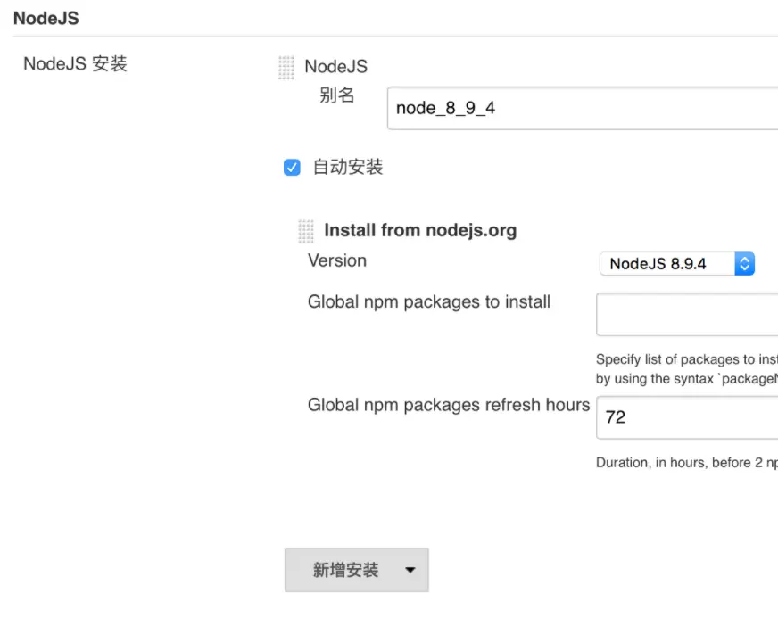 NodeJS Plugin安装完毕后,还需要选择系统管理->全局工具配置,配置node下载及安装: