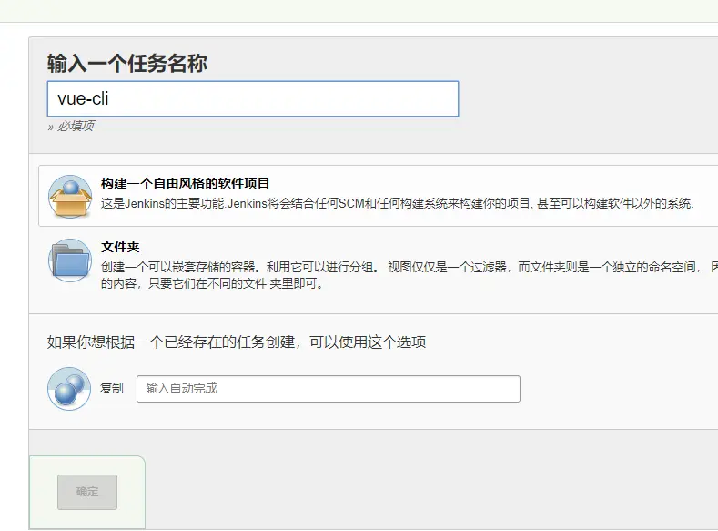 在这里我们实现从github拉取vue-cli项目,然后在jenkins中实现编译。 新建任务,构建自由风格的软件项目。