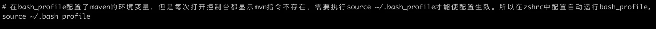 当我执行完2-2的操作后,满怀欣喜的以为配置完了。但是当我重新打开一个控制台,并输入mvn -v显示command not found。解决办法是在~/.zshrc文件(我的控制台是zsh)中添加一句source ~/.bash_profile。这样每当zsh打开时,都会自动运行一次命令。