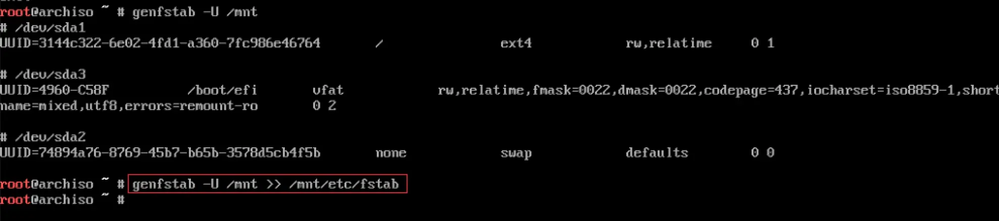genfstab -U /mnt >> /mnt/etc/fstab