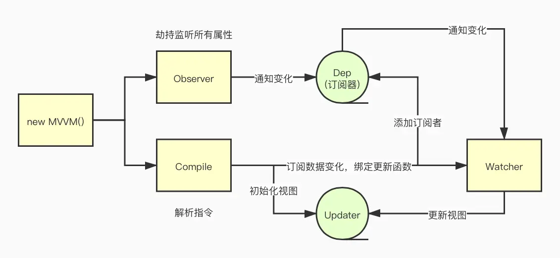 具体就是:MVVM作为绑定的入口,整合Observe,Compil和Watcher三者,通过Observe来监听model的变化,通过Compil来解析编译模版指令,最终利用Watcher搭起Observe和Compil之前的通信桥梁,从而达到数据变化 => 更新视图,视图交互变化(input) => 数据model变更的双向绑定效果。