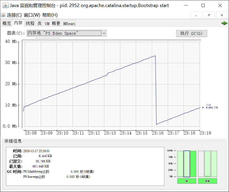 “内存”页签相当于可视化的 jstat 命令,用于监视受收集器管理的虚拟机内存的变化趋势。