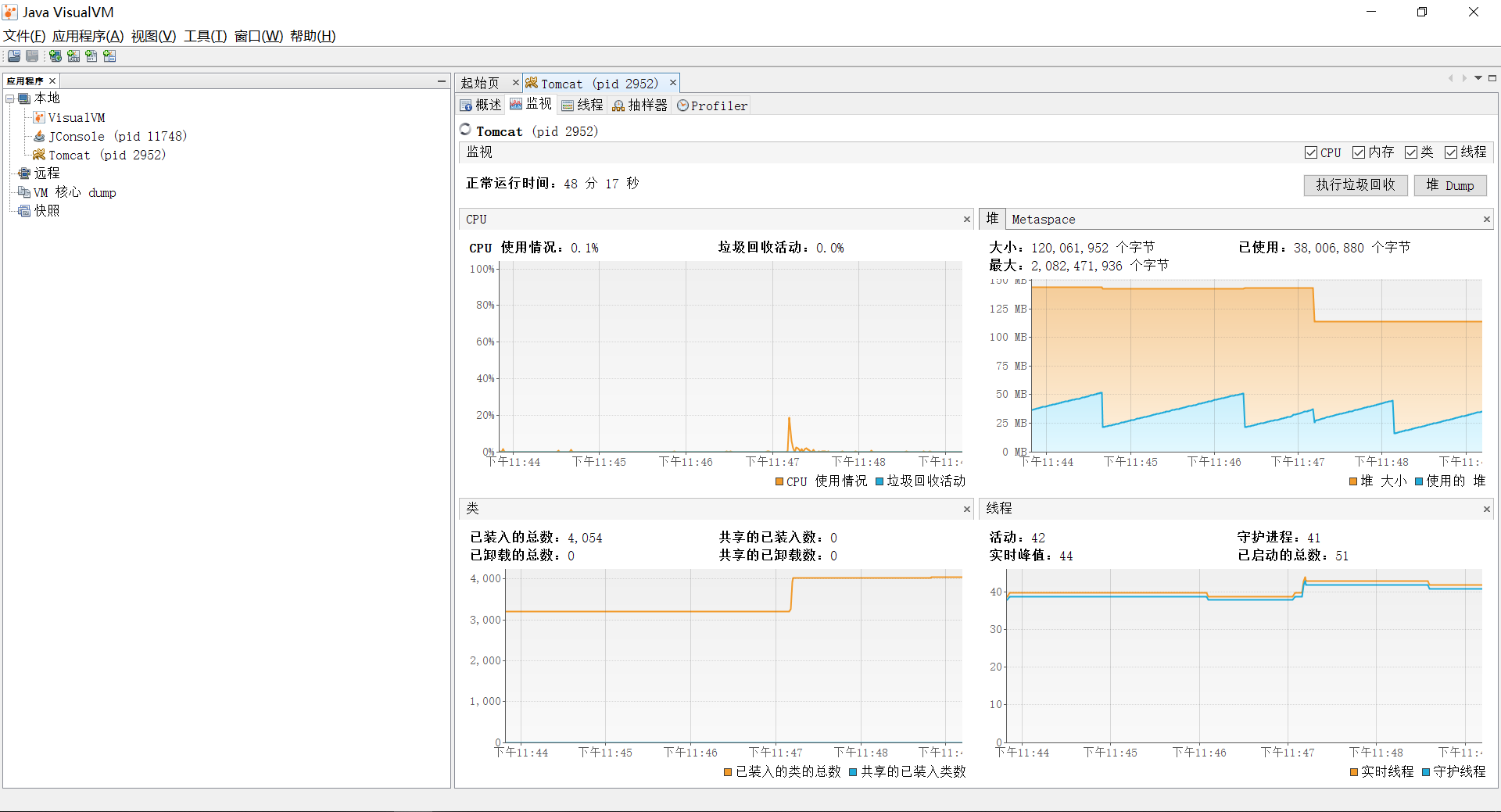 “监视”页签和“线程”页签,用于监视应用程序的 CPU、内存、类以及线程的信息(jstat、jstack)。