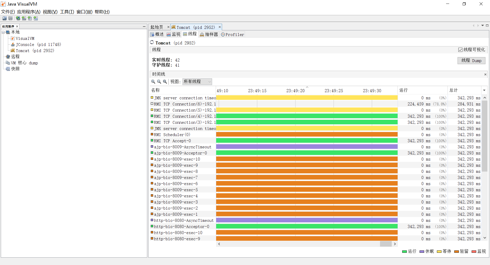 “线程”页签相当于可视化的 jstack 命令,遇到线程停顿时可使用该页签进行监控分析。