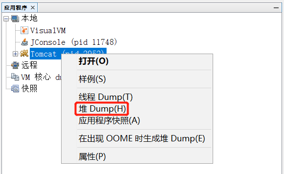 - 右键单击应用程序节点,选择“堆 Dump”。