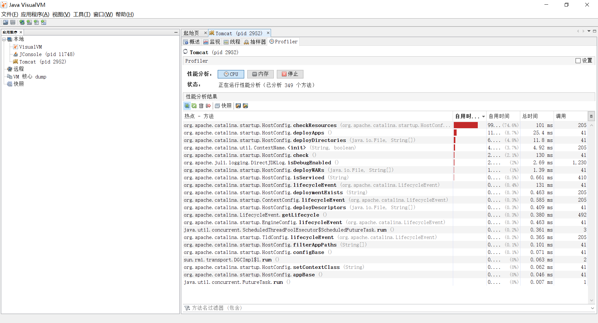 “Profiler”页签中,VisualVM 提供了程序运行期间方法级的 CPU 执行时间分析以及内存分析。