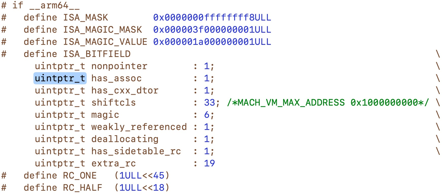 nonpointer :1 表示是否对isa指针开启指针优化;0代表纯isa指针,1代表不止是类对象指针,还包含了类信息、对象的引用计数等;