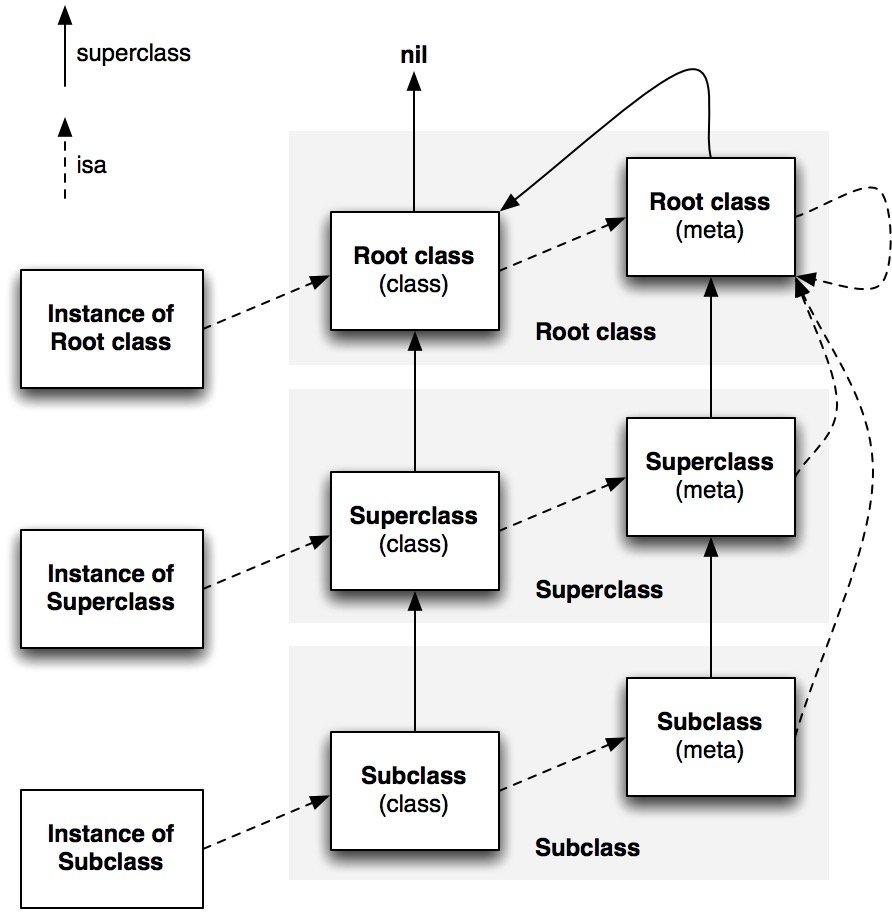 对象 -> 类 -> 元类 -> 根元类 -> 根元类(根元类的isa指向自己)