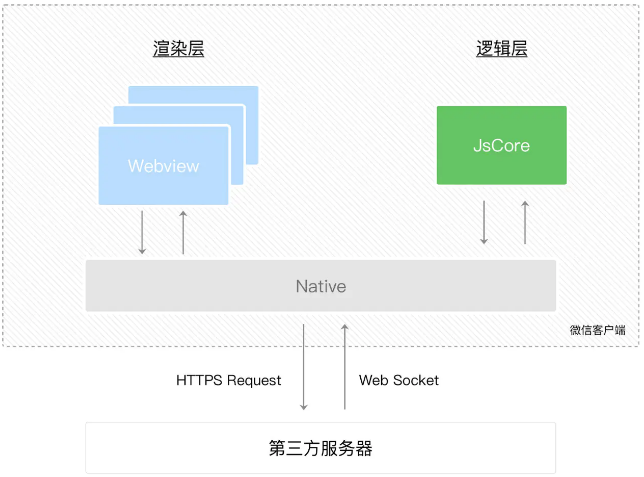 小程序分为逻辑层和渲染层,而我们每次逻辑层改变了,要借由 Native 进行。小程序的渲染层和逻辑层由两个线程管理:渲染层的界面使用了 WebView 进行渲染;逻辑层采用 JsCore 线程运行 JS 脚本。一个小程序存在多个界面,所以渲染层存在多个 WebView 线程,这两个线程的通信会经由微信客户端 Native 做中转,逻辑层发送网络请求也经由 Native 转发,请看下图: