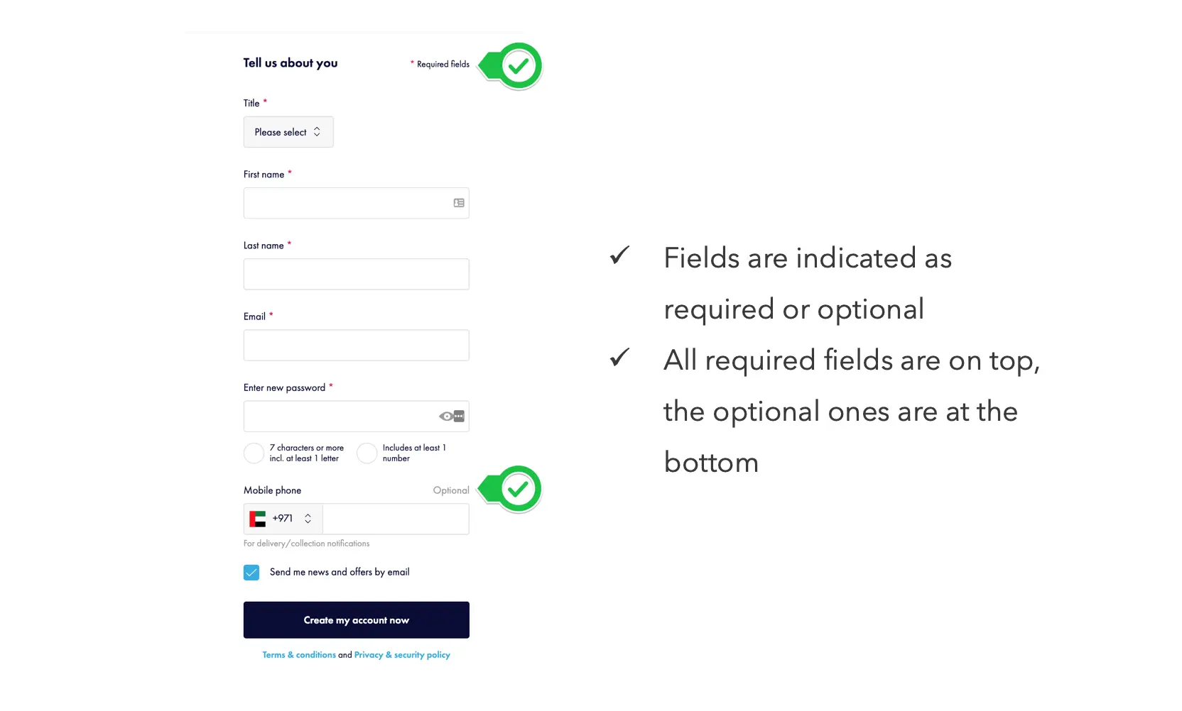 必须清楚标明每个必填项。用 * 表示必填项其实作用不大,但是这总比你什么都不标明好。在顺序上,你应该把必填项放在前面,可选项放在后面。