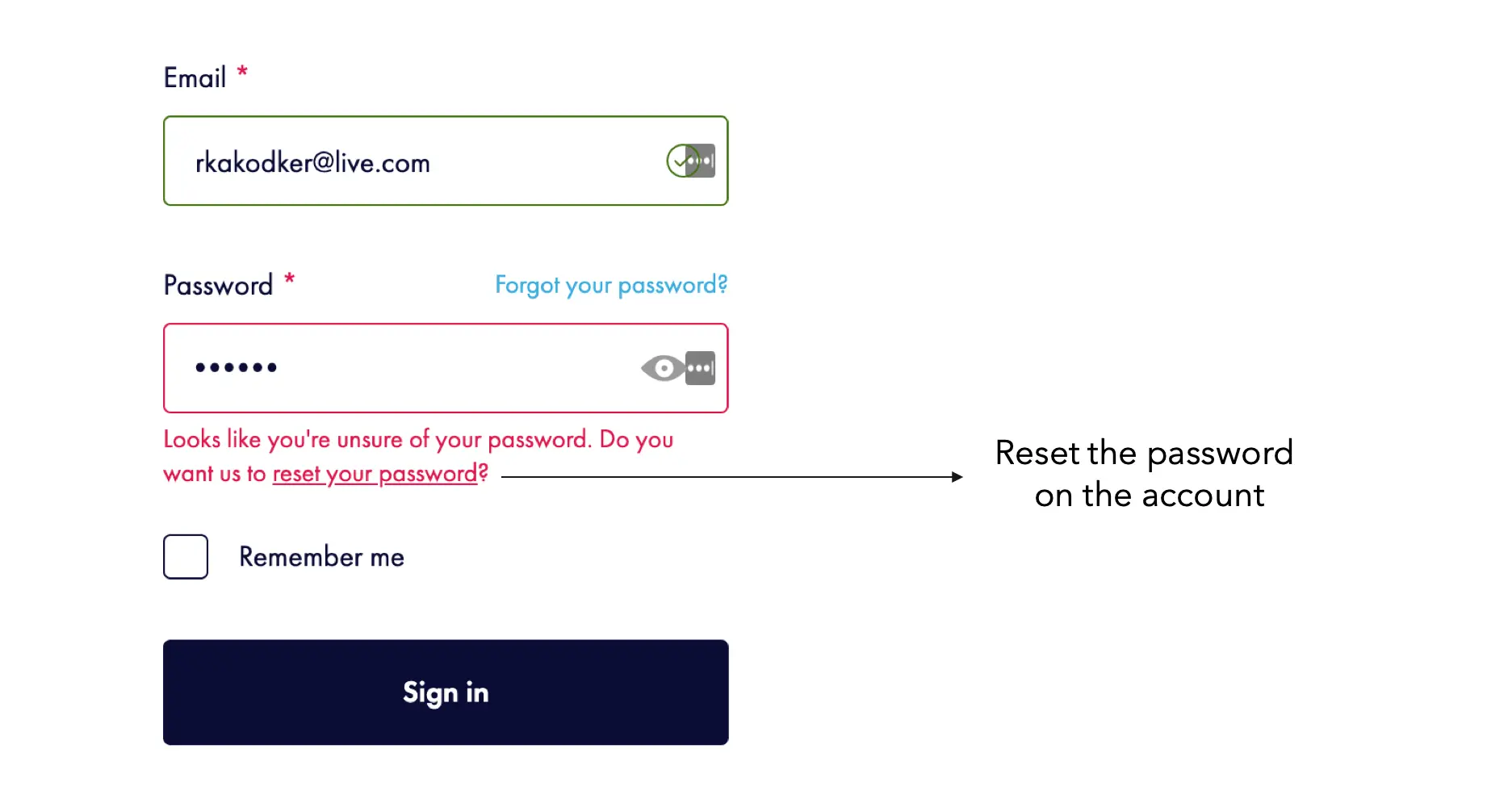 如果用户输入的邮箱和密码不匹配,他可能想要重置密码。在他选择重置密码后,你不应该让他在表单中重新输入一遍邮箱。如果可能的话,尽可能把这个过程处理得快速简洁 —— 在用户点击重置选项后,隐藏原有密码输入框,并将“登录”按钮修改为“重置密码”按钮。