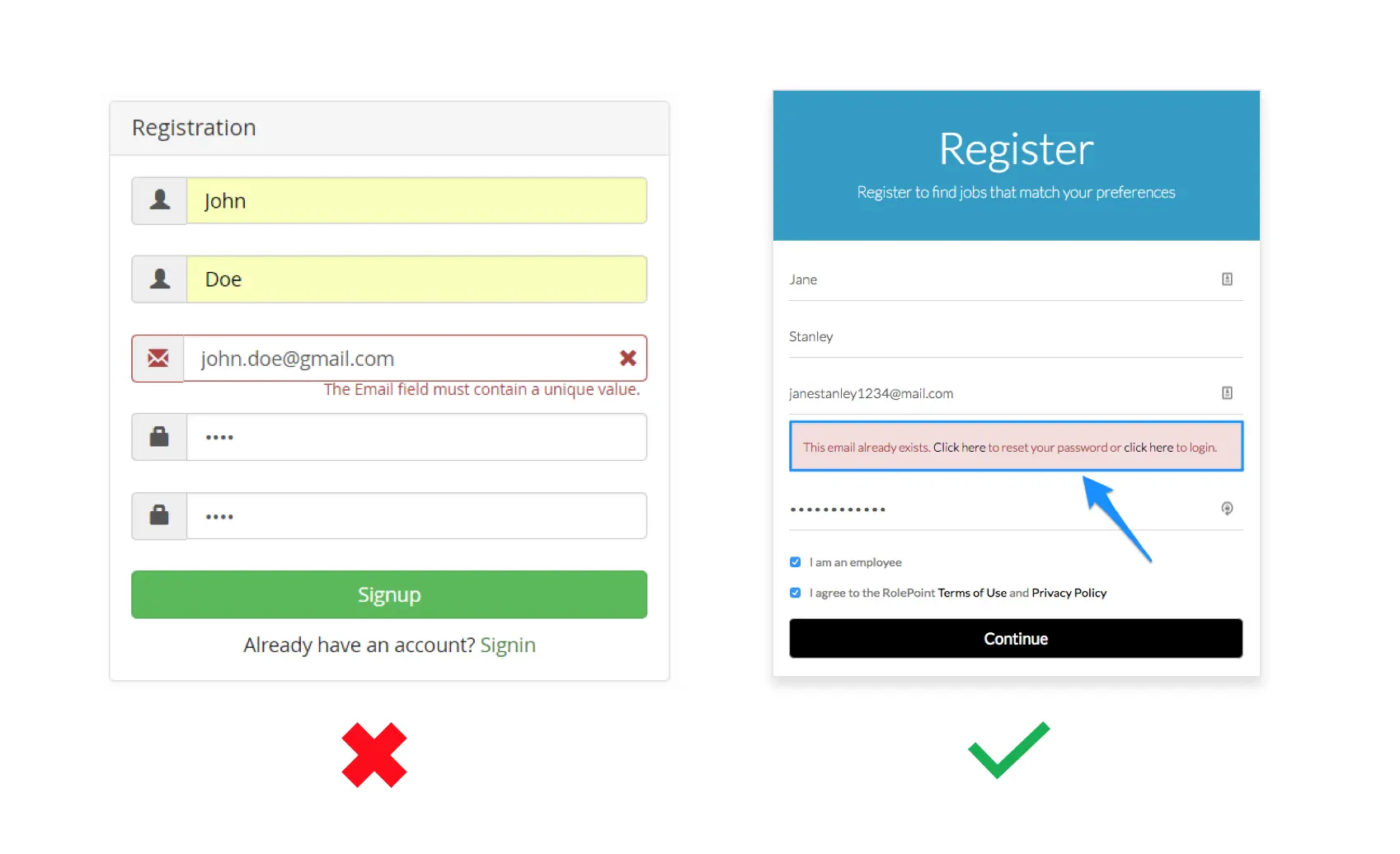 如果用户输入的邮箱已经存在于你的数据库中,仅仅告诉用户“邮箱已存在“是不够的,这会陷入死胡同。你应该给出原因以及用户可以采取的措施: