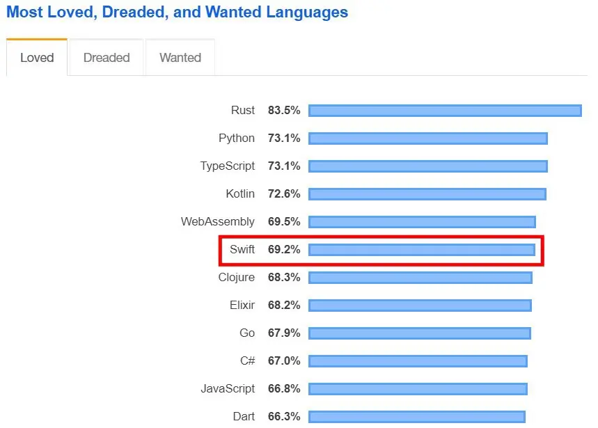 像其他很多现代编程语言一样,开发者也喜爱 Swift 编程语言。根据 StackOverflow 调查,Swift 在最受喜爱编程语言中排名第六位:
