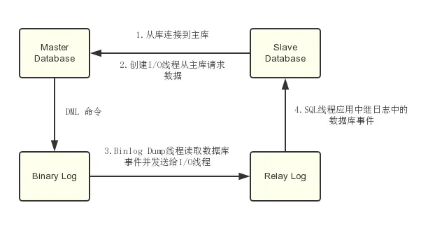 主从复制是指将主数据库的DDL和DML操作通过二进制日志传到从数据库上,然后在从数据库上对这些日志进行重新执行,从而使从数据库和主数据库的数据保持一致。