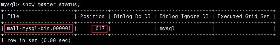 - 连接到主数据库的mysql客户端,查看主数据库状态: