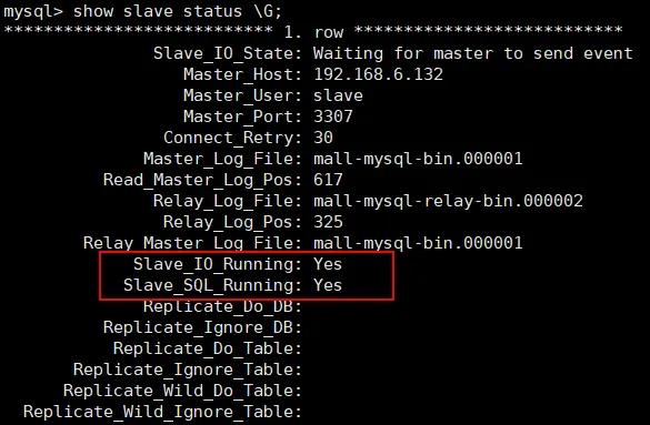 change master to master_host='192.168.6.132', master_user='slave', master_password='123456', master_port=3307, master_log_file='mall-mysql-bin.000001', master_log_pos=617, master_connect_retry=30;