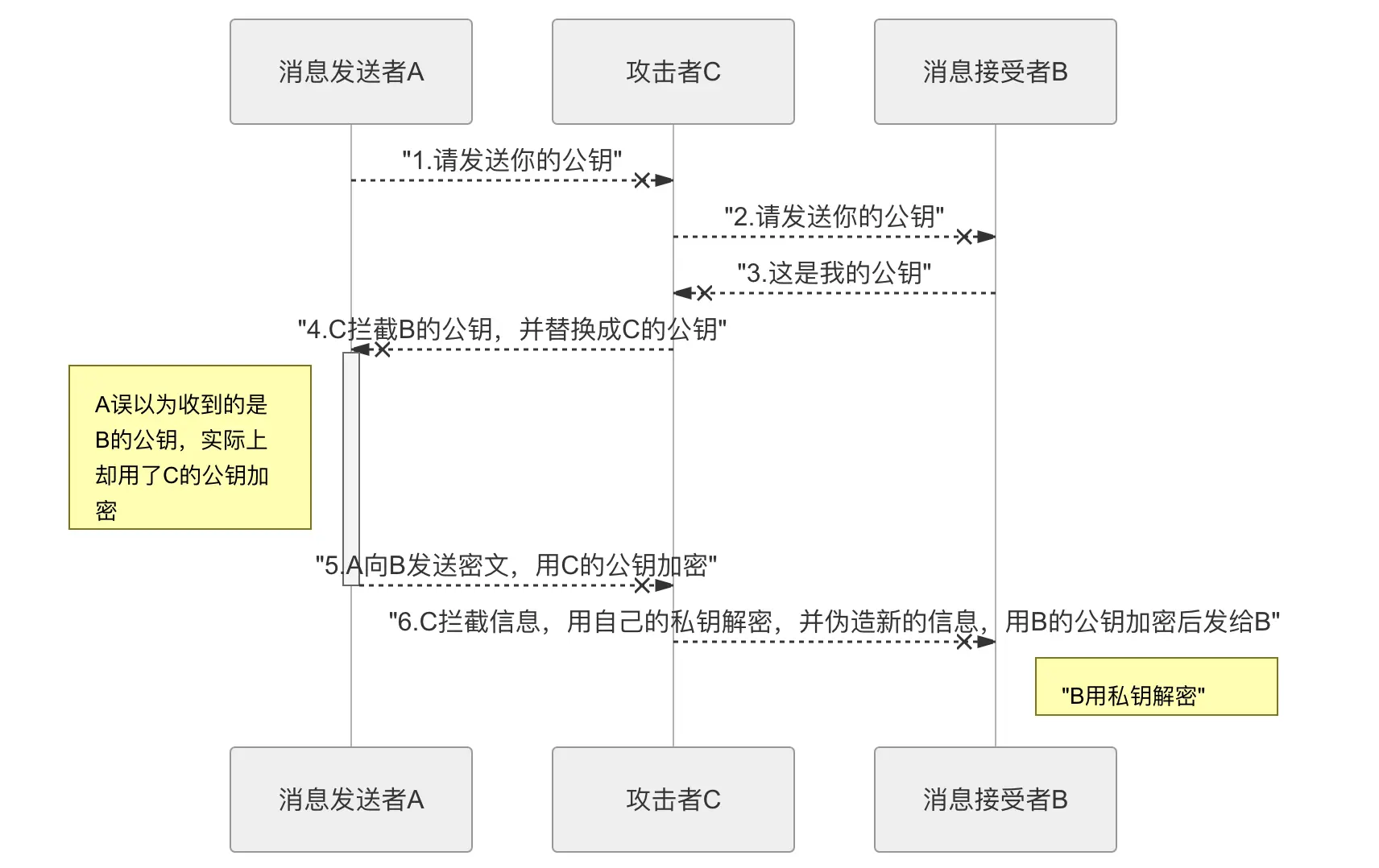 - A将C的公钥当成了B的公钥,并用其加密信息,发给B。