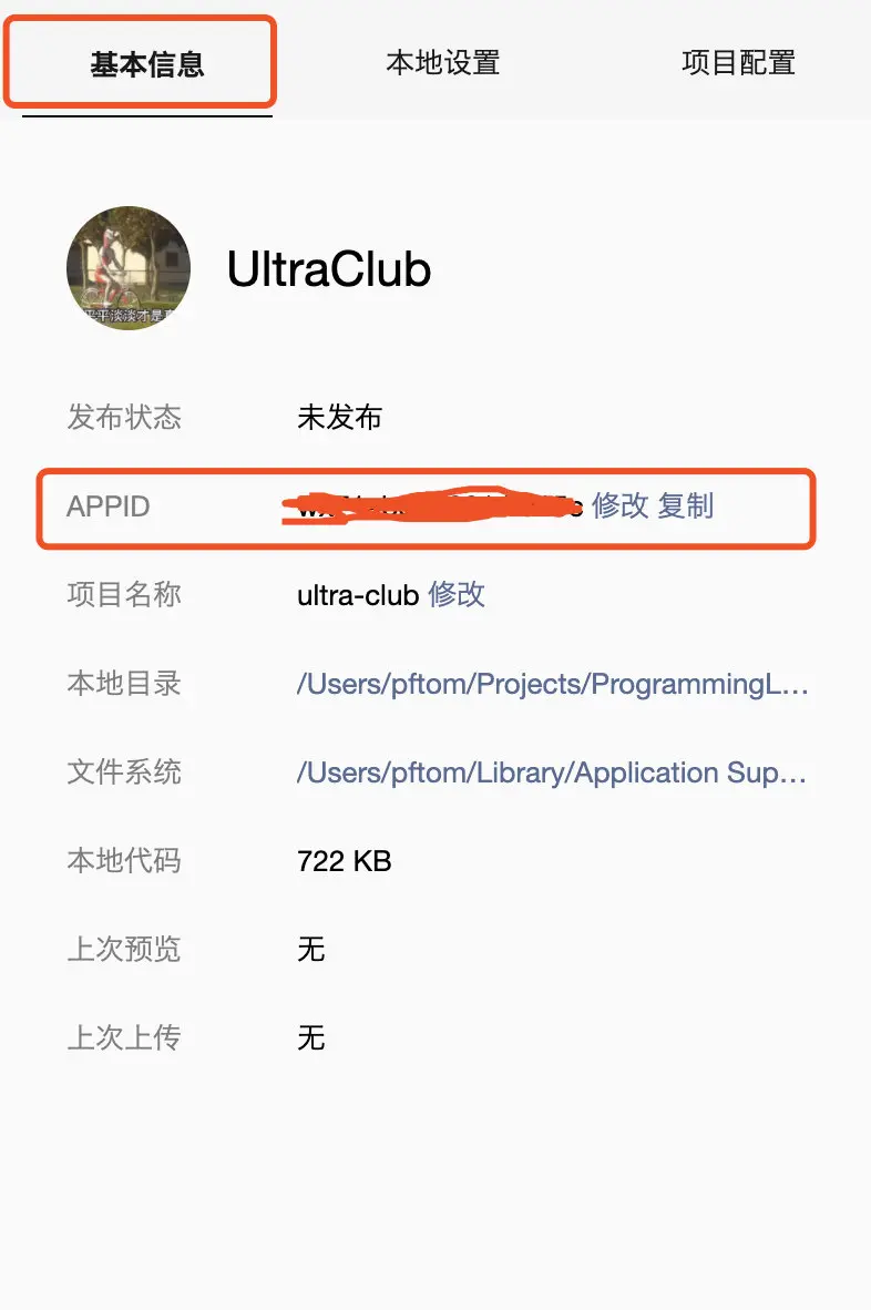 4.找到设置栏的基本信息,AppID 栏将其修改为上面的 AppID 如下: