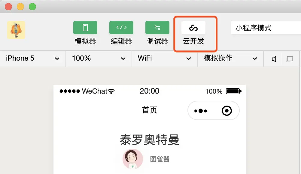 5.当设置了 AppID 之后,我们的开发者工具里面的 “云开发” 按钮应该就会变成可点击状态,找到左上角的 “云开发” 的按钮并点击,类似下面这张图: