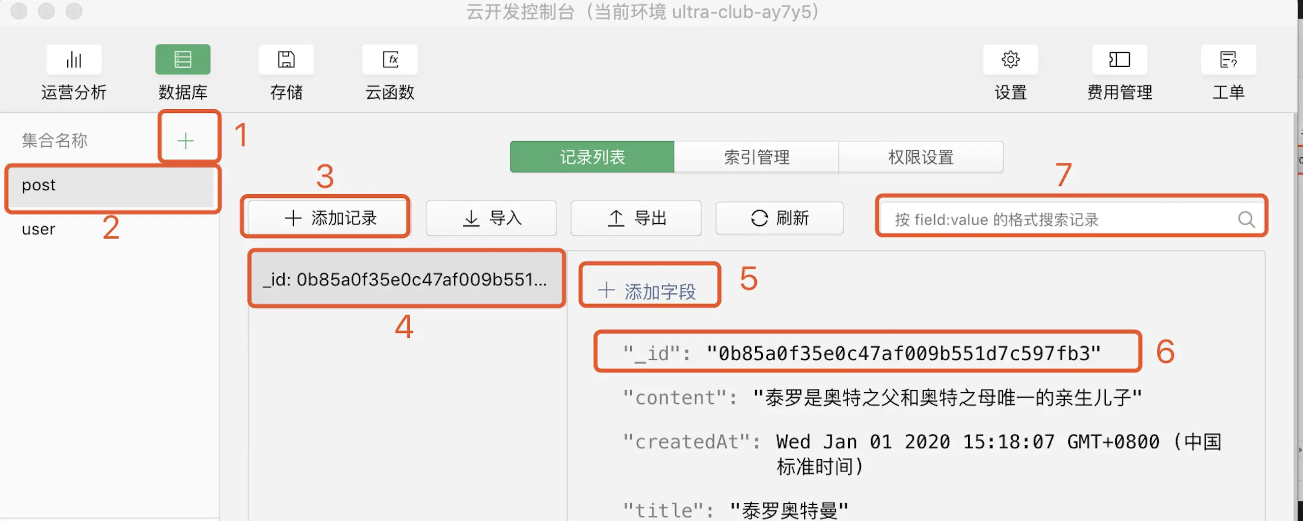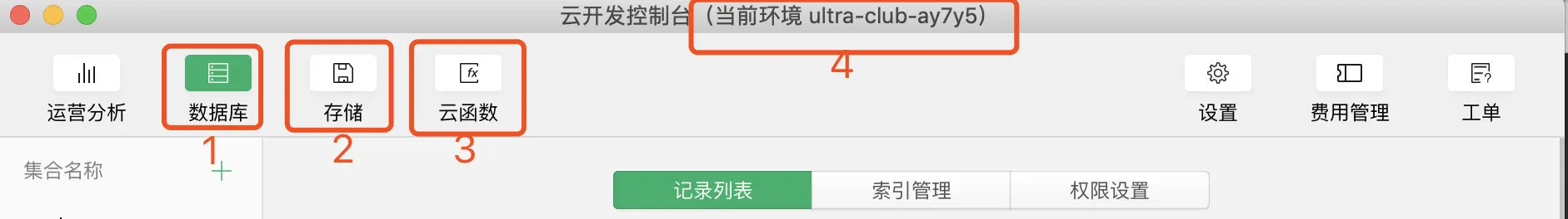 - 其中序号为 1 的就是我们的云数据库,它是一个 JSON 数据库,里面存储着我们在开发时需要的数据。