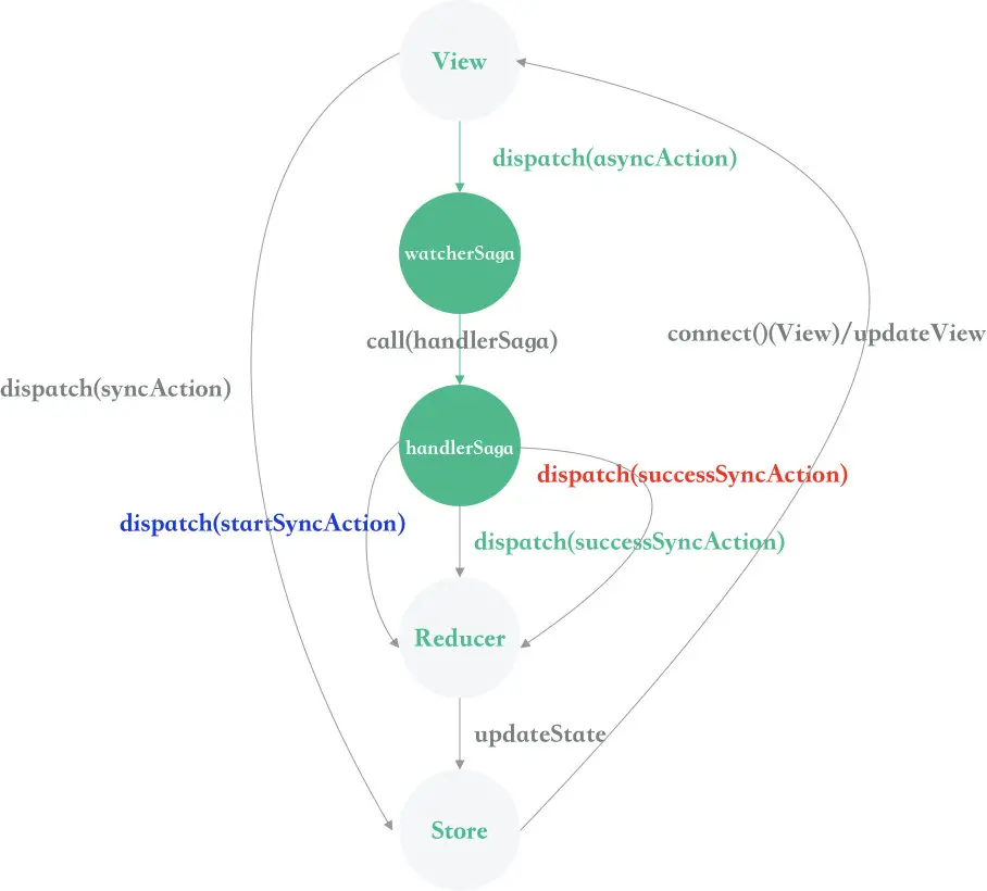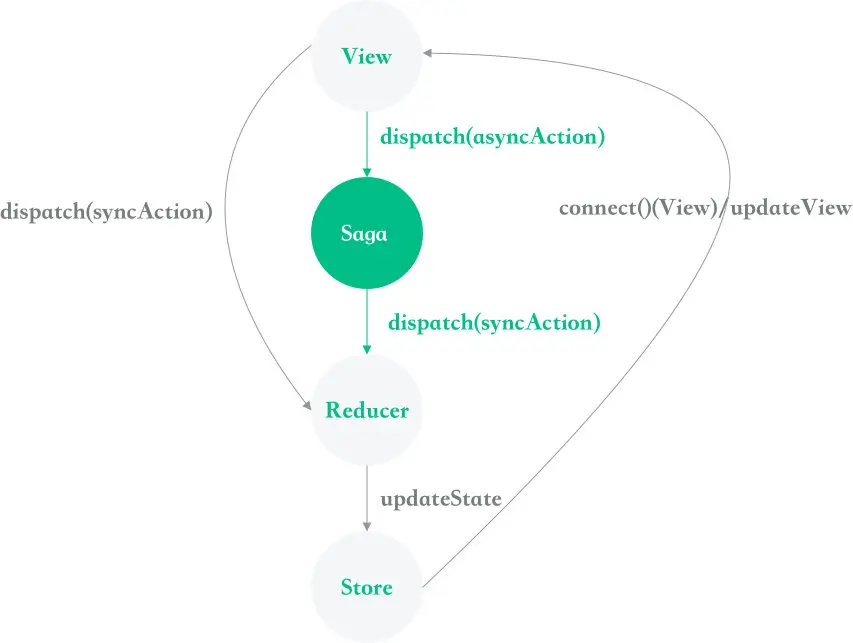 现在我们要去向小程序云发起请求,这个请求是一个异步的请求,它不会立刻得到响应,所以我们需要一个中间状态(这里我们使用 Saga)来回处理这个异步请求并得到数据,然后再执行和之前同步请求类似的路径,即为我们上图中绿色的部分+剩下灰色的部分,所以异步工作流程就变成了这样: