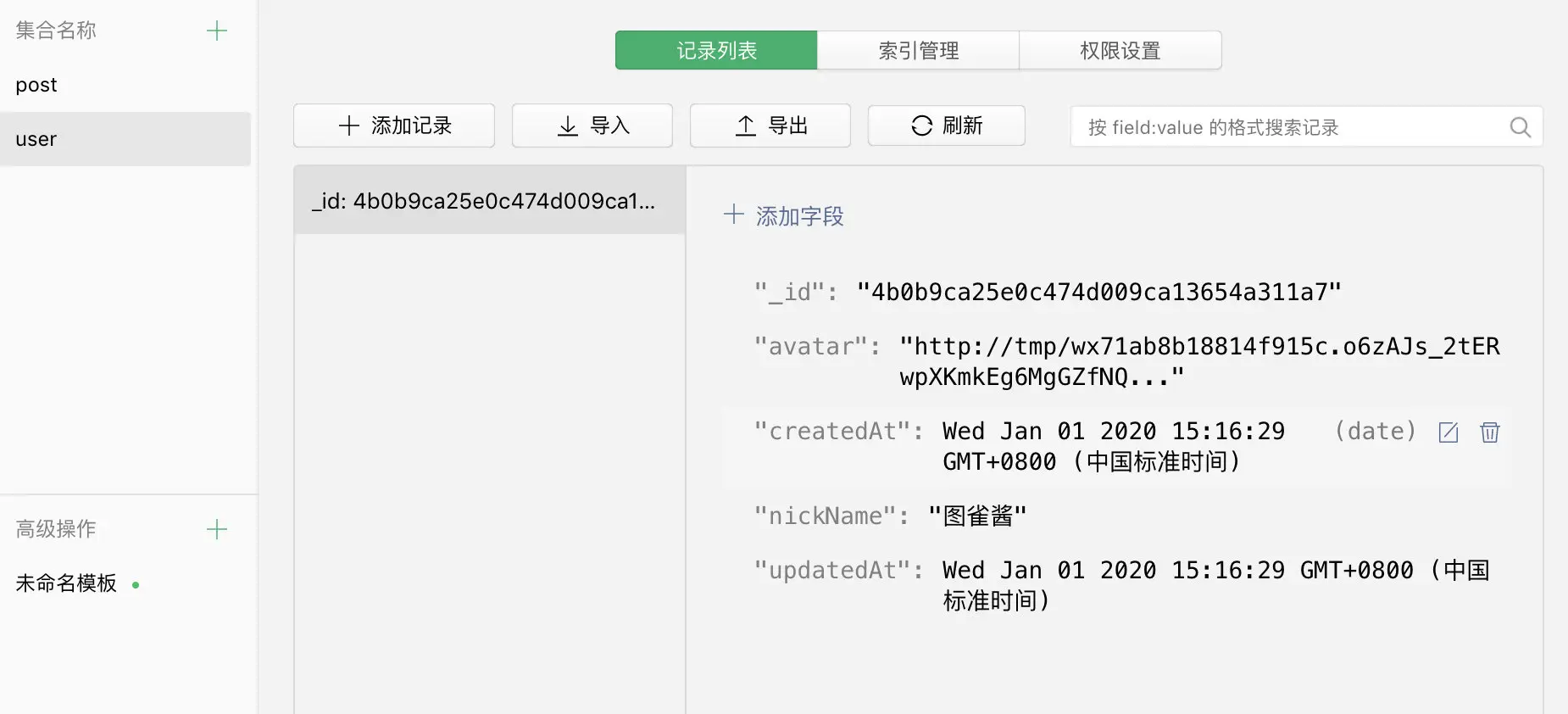 _id:此用户在user集合中的唯一标识符avatar:此用户的头像地址nickName:此用户的昵称,我们将用它来进行登录createdAt:创建此记录的时间updatedAt:上次更新此记录的时间