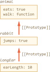 然后使用 rabbit.eats(**) 读取属性 eats,发现不在 rabbit 里,因此 JavaScript 会接着 查找 [[Prototype]] 引用,最终在 animal 中发现了这个属性(从下往上看图)。