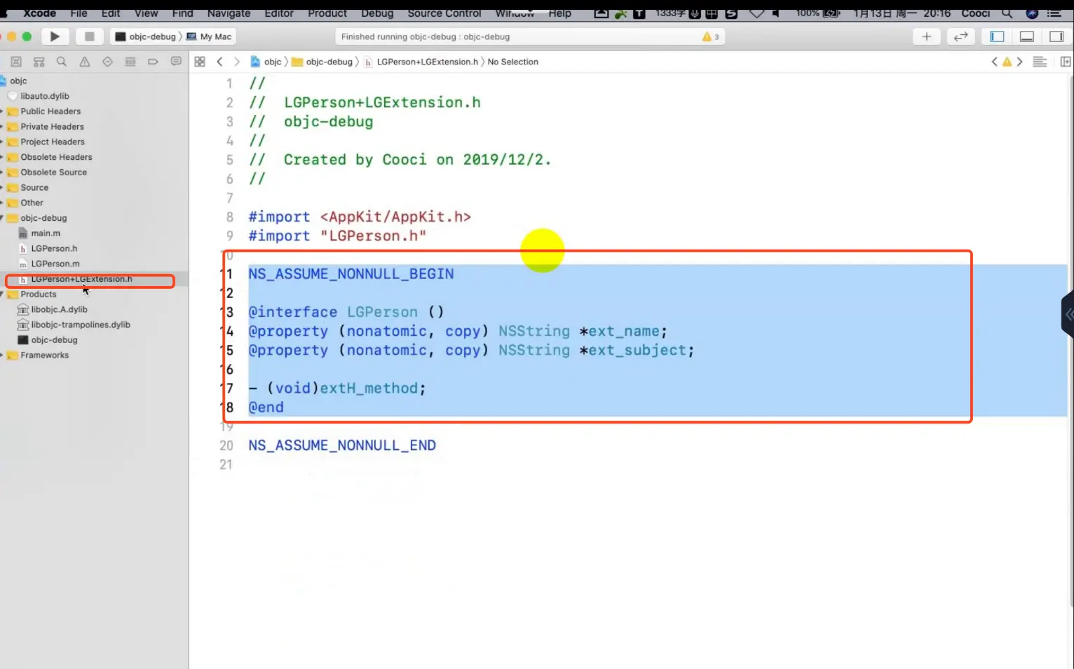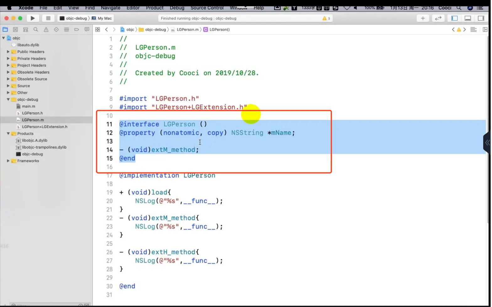 类拓展在代码实现形式有2种方式,第一种写到所在本类的.m文件中,第二种另一个单写一个.h文件。常用第一种: