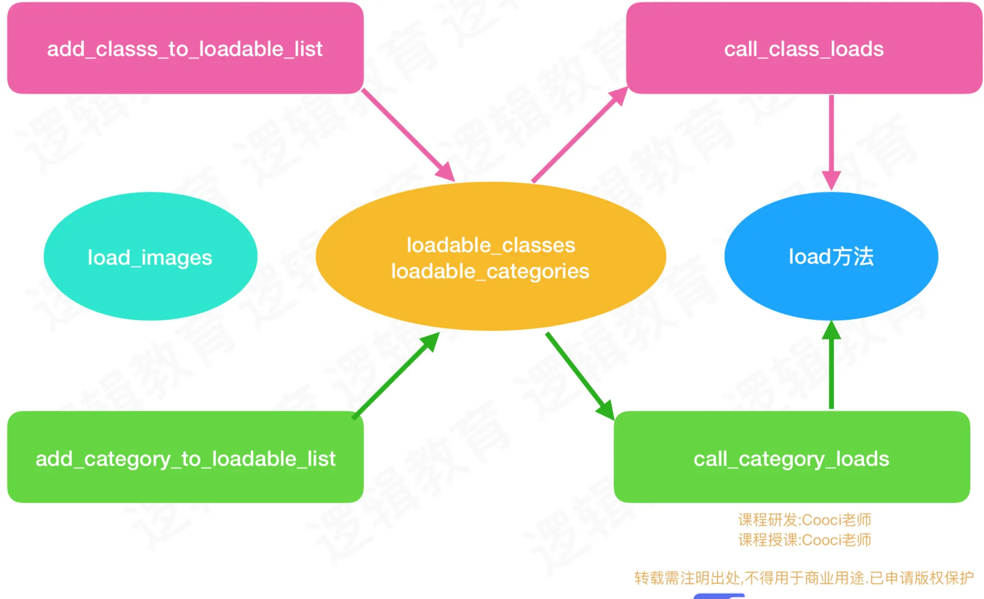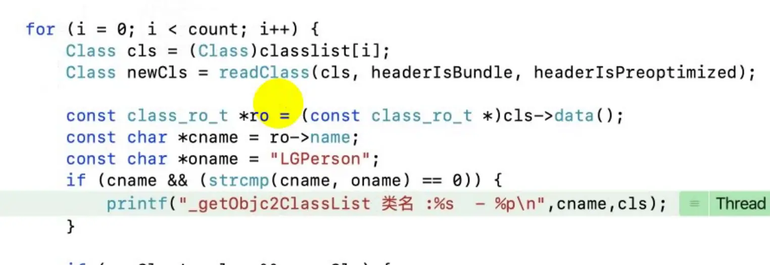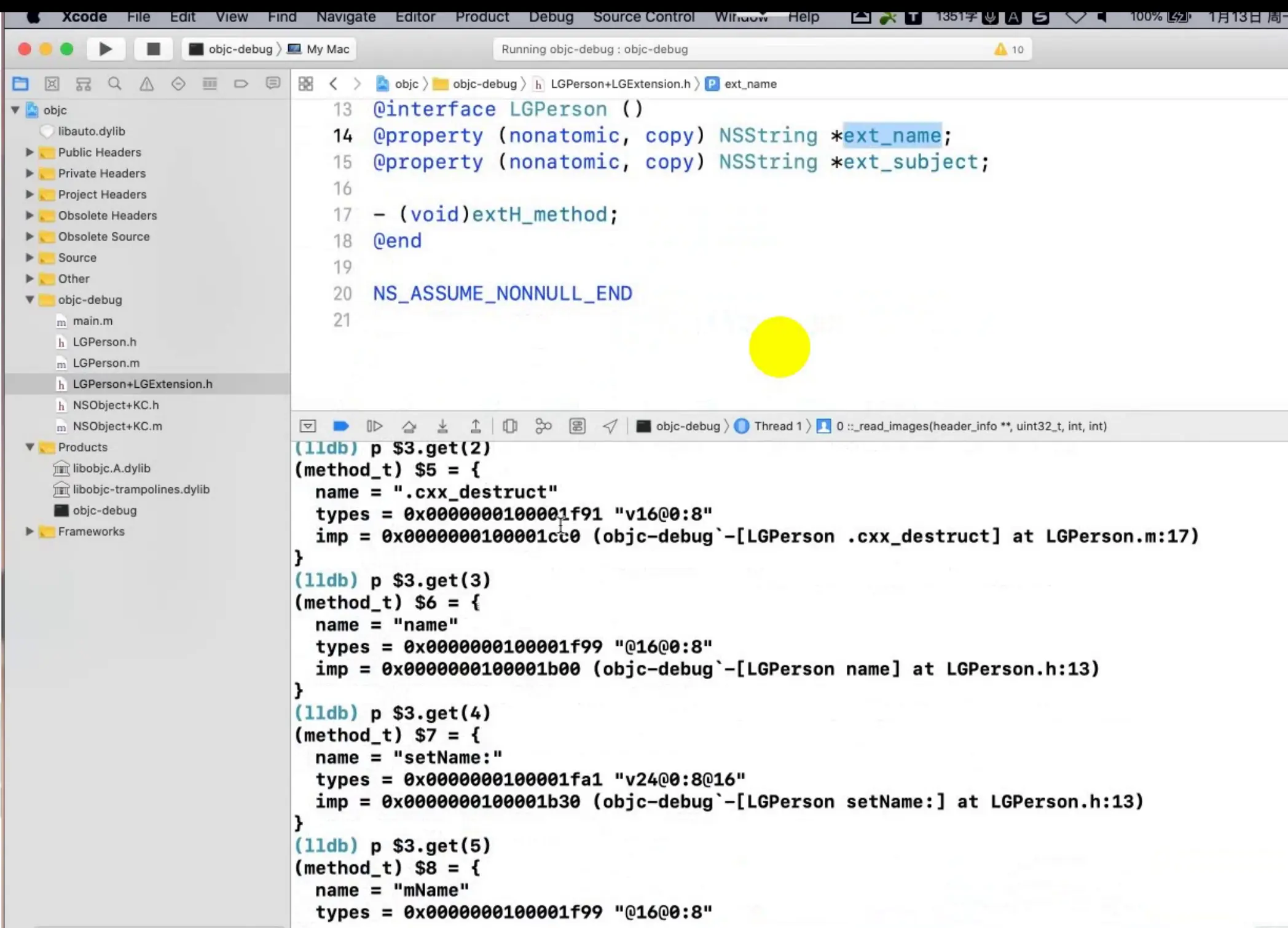编译时间的确定: 在read——images的类的加载中,如下处设置断点,编译时进入断点,查看ro中包含类拓展的属性和实现的get,set方法,可以判断出类拓展在编译时就加载了。而此时类加载后没有分类的信息,由此可以判断分类是在运行时加载进来的。
