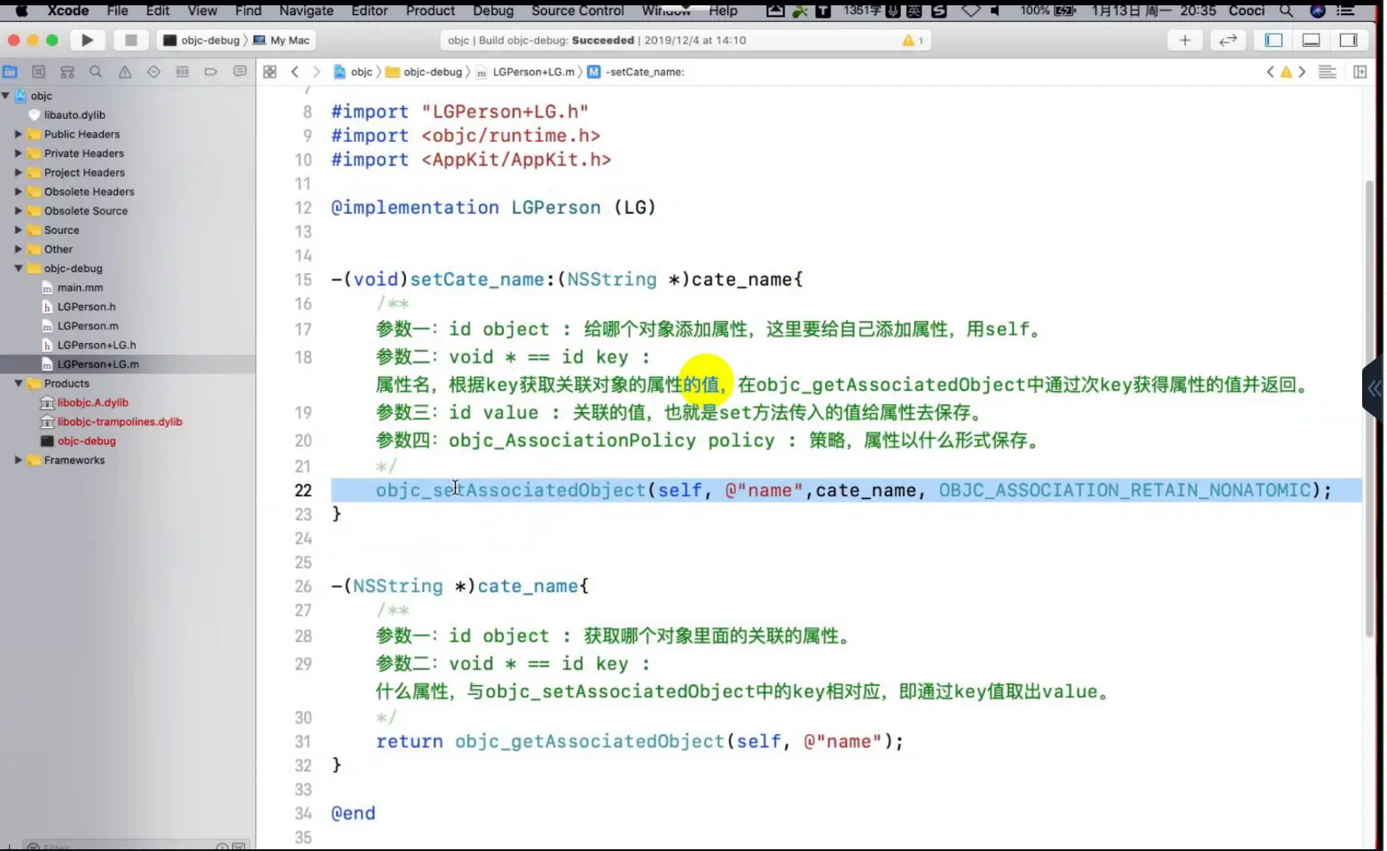 在分类的.m文件中,通过调用 objc_setAssociatedObject 和 objc_getAssociatedObject 把新的属性对应的value 存储起来或者取出来。