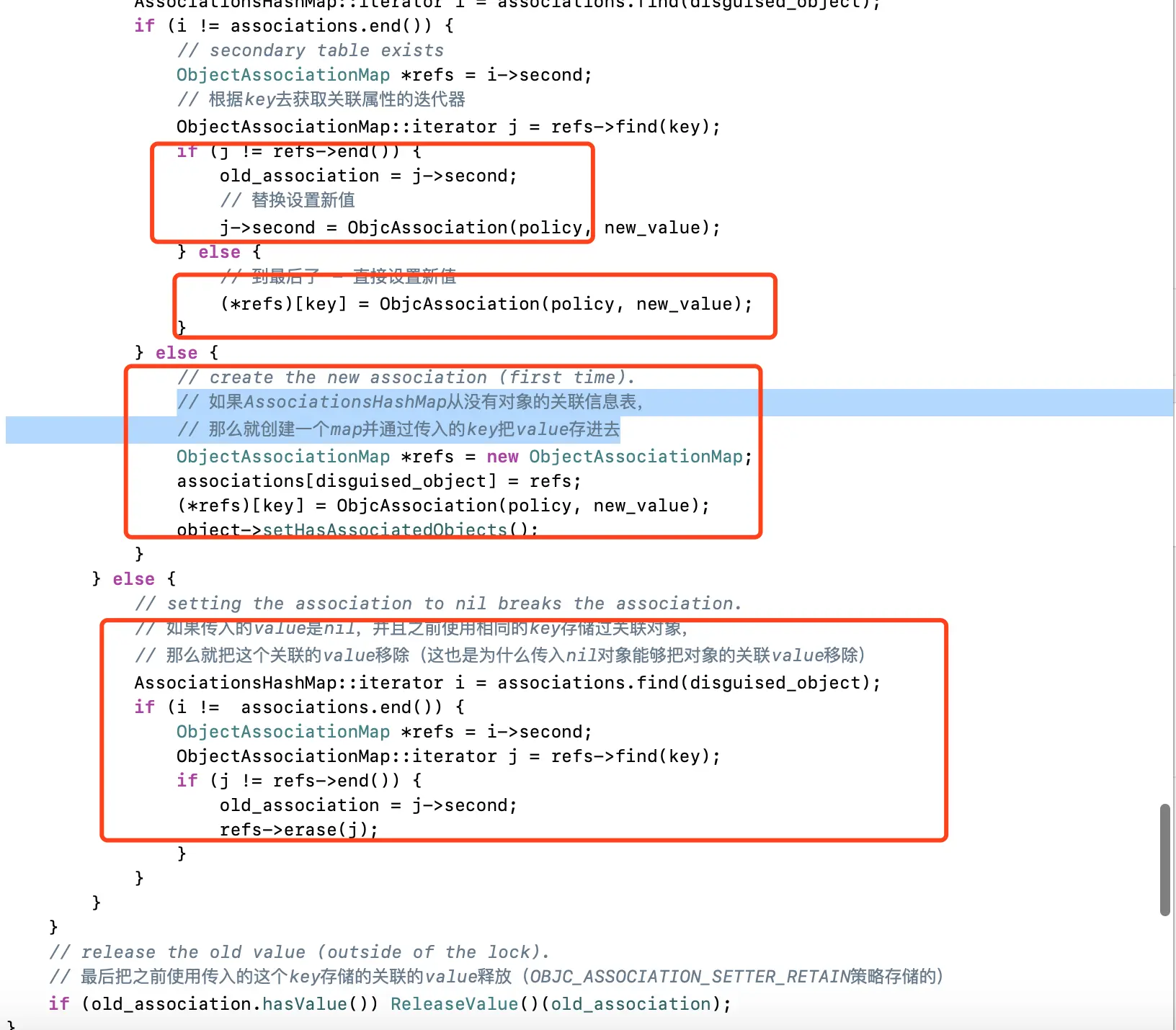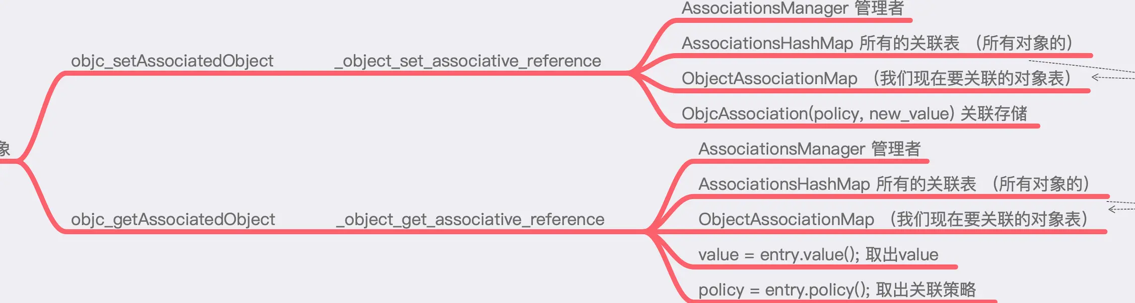 下图中,hashmap中通过对象的指针地址为key取到对应的对象小表,再通过对象的属性key值为下标取到对应key值中对应的value值或者存储value值。 注意:通过key存value时候,如果value为nil,并且之前使用相同的key存储过关联对象,那么就把这个关联的value移除(这也是为什么传入nil对象能够把对象的关联value移除,如果key对应的value查找没到最后一个,替换设置新值,若果到了最后一个则直接设置新值。 如果AssociationsHashMap从没有对象的关联信息表, 那么就创建一个map并通过传入的key把value存进去
